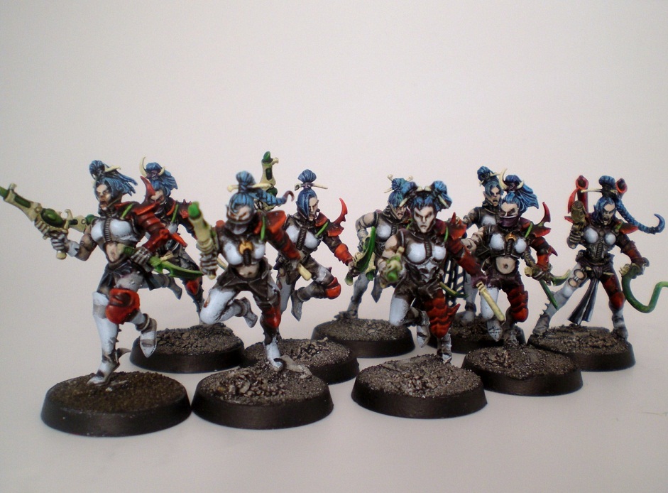 From the complete lack of comments, I guess no one really cared for the Wychs from the last post. So, I thought it would be a good time to post up my other Warrior squad. They are kitted out with the same gear as the other unit-- the Blaster and Splinter Cannon combo. All together, I have 3 completed infantry units now. All there is left to paint?